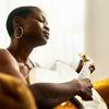 Description: A black woman playing the acoustic guitar with her eyes closed